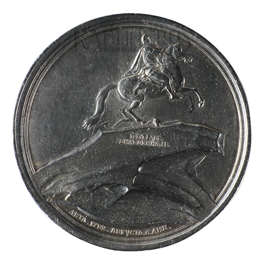 В 1768 г. императрица Екатерина II издала указ о постройке памятника Петру I на Сенатской площади Санкт-Петербурга.В Санкт-Петербург для работы был приглашен французский скульптор, профессор Парижской академии живописи и скульптуры Этьен-Морис Фальконе, которого рекомендовали Дидро и Вольтер. Помощница и друг Фальконе Мари-Анн Колло вылепила голову Петра. За свою работу она была избрана членом Императорской академии художеств, а императрица Екатерина II назначила художнице пожизненную пенсию в 10.000 ливров.Змею, попираемую ногой коня, изваял для монумента русский скульптор Ф. Г. Гордеев. Пьедесталом стал гигантский гранитный валун, «Гром-камень» (весом 80 тысяч пудов), с трудом доставленный к месту сооружения (по этому случаю была отчеканена особая медаль). Надпись на пьедестале: «Петру I. Екатерина II.» подчеркивает замысел императрицы: установить линию преемственности между деяниями Петра и собственной деятельностью. Создание монумента длилось 12 лет и обошлось казне в 424610 рублей. 7 августа 1782 г., в день столетия со дня вступления на престол Петра I, прошло торжественное открытие памятника Петру I.