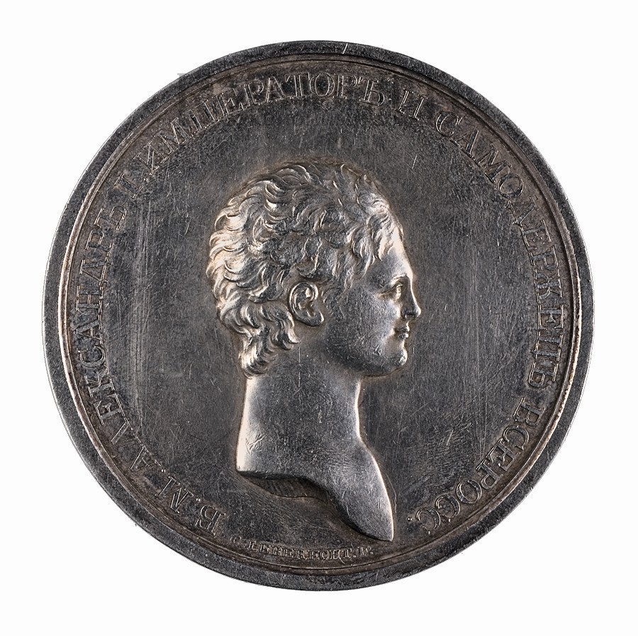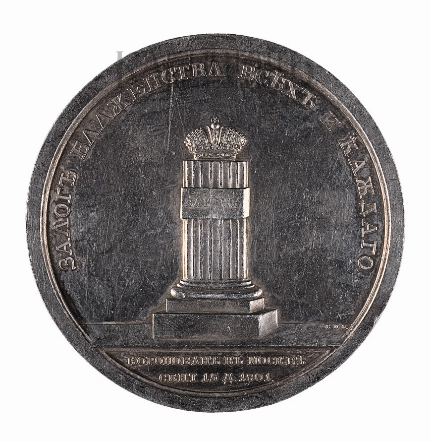 Граверы: аверс – К. Леберехт, реверс – К. МейснерСанкт-Петербургский монетный двор. 1801 г.Диаметр 65 мм. Вес 91,12 г. СереброДьяков 264.1, Смирнов 332/аДовольно редкая