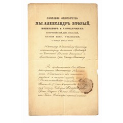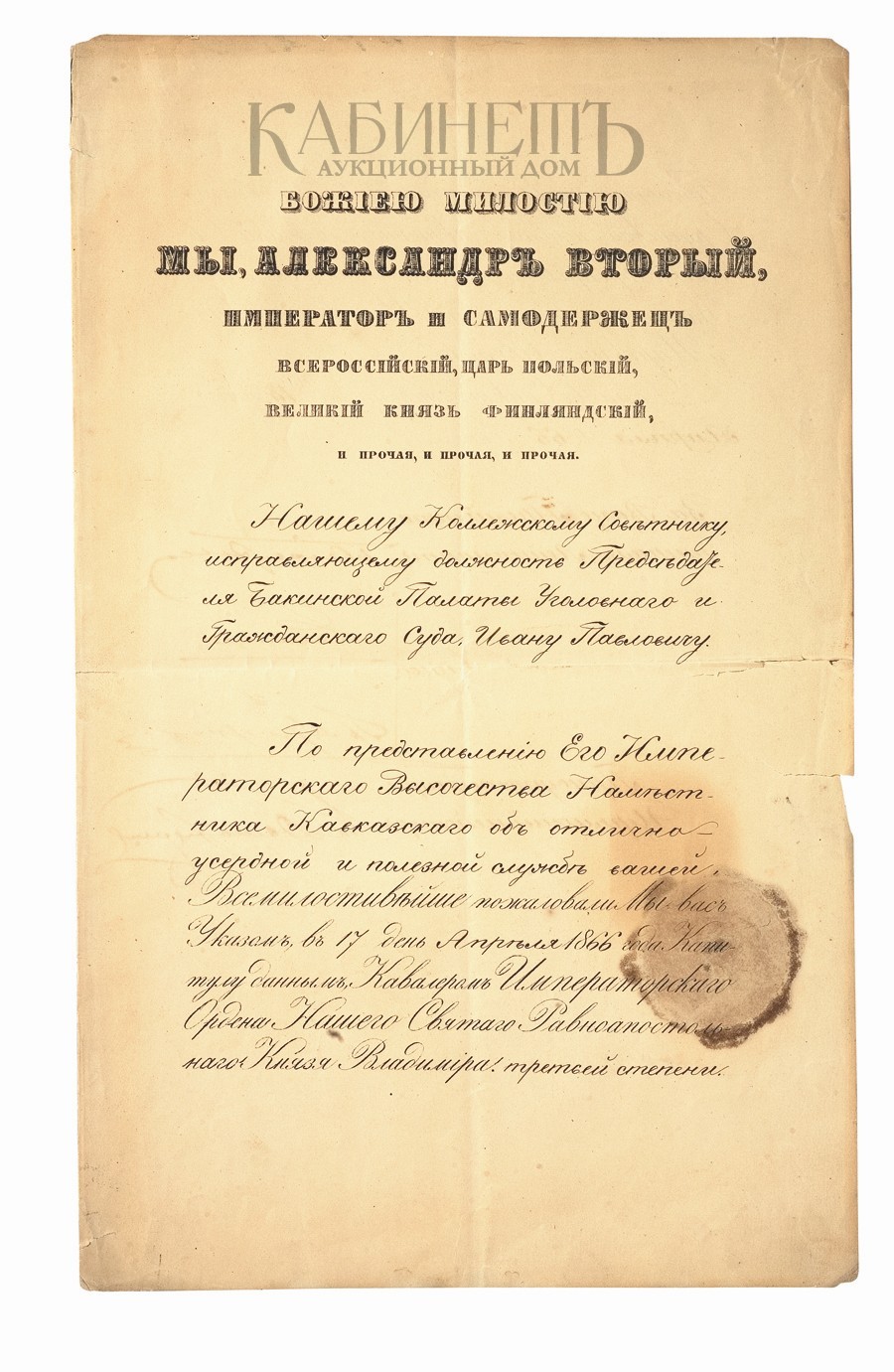 Архив аукциона №8 (20) Лот 7 Грамота о пожаловании коллежского советника, председателя Бакинской палаты