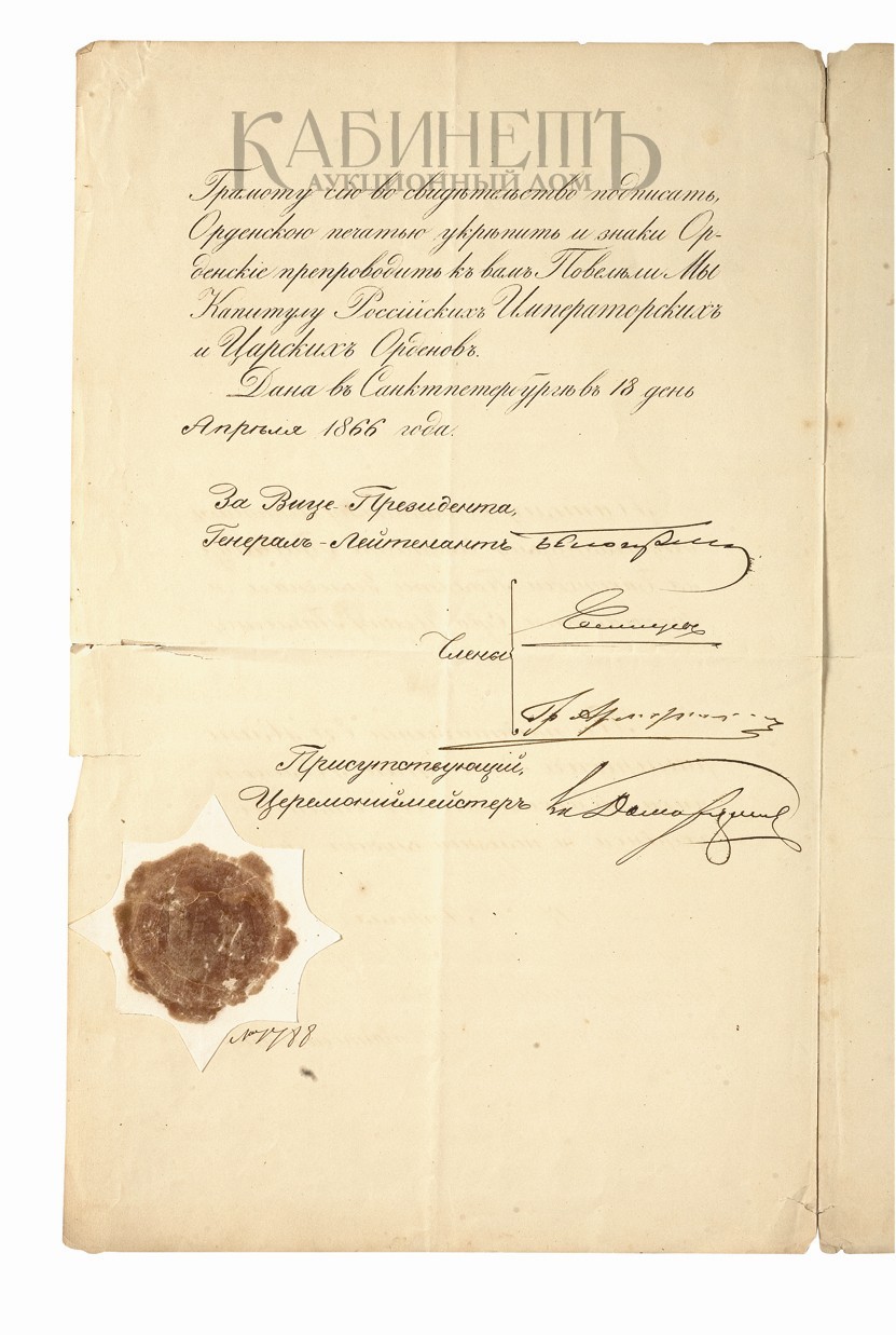 Российская империя. 1866 г. Размер 350 х 224 мм. Бумага, типографская печать, орешковые чернила Оттиск печати ордена Святого Владимира (сургуч, бумага)