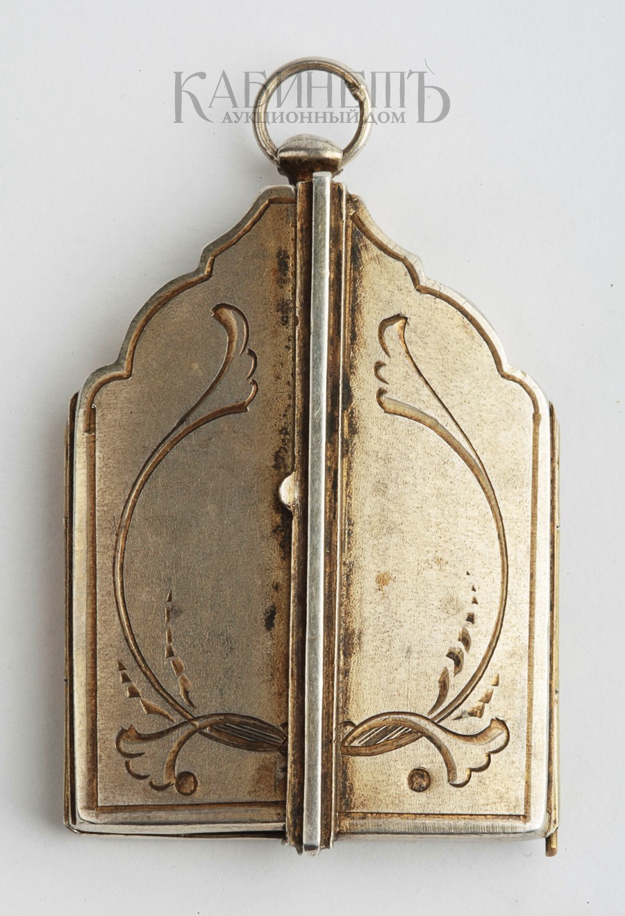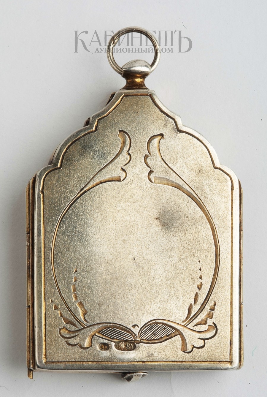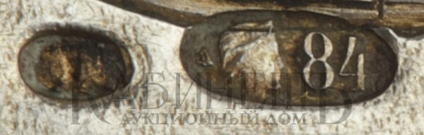 Клейма: пробирное «84», c женской головкой, повернутой вправо, в щитке в форме лопатки, для маловесных изделий, именник мастера «ИК » в овальном щитке.