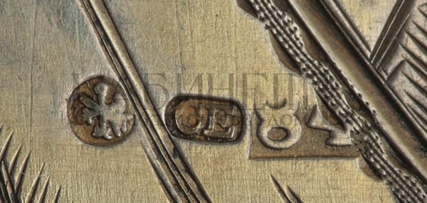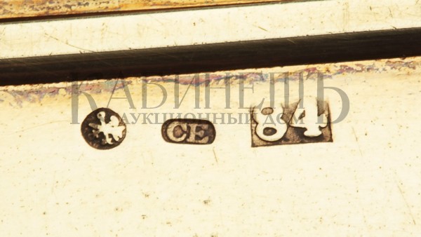 Клейма: пробирное «84» в прямоугольном щитке, клеймо г. Санкт-Петербурга в круглом щитке, именник мастера «СЕ».