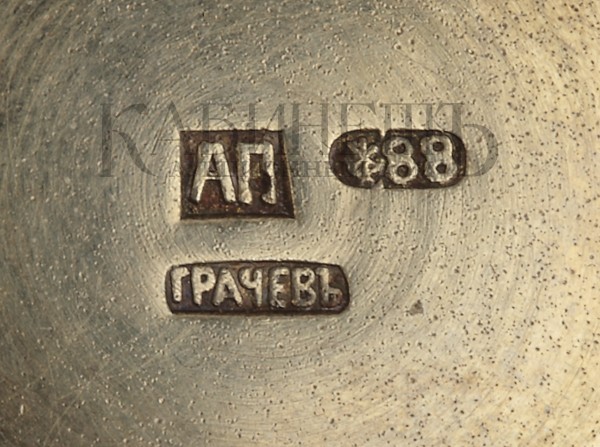 Клейма: пробирное «88», с городским клеймом Санкт-Петербурга; именник мастера «АП »; развернутое клеймо фирмы «ГРАЧЕВЪ».