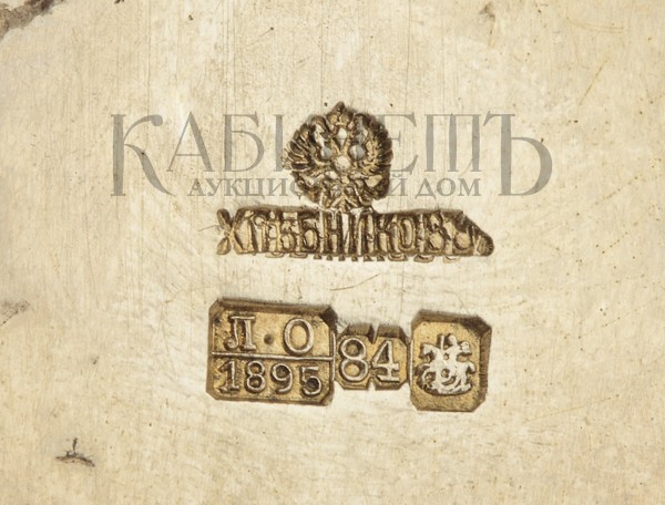 Клейма: на дне – развернутое клеймо фирмы «ХЛЕБНИКОВ Ъ» с гербом Российской империи, инициалы пробирного инспектора с датой «1893», пробирное «84» с клеймом г. Москвы.