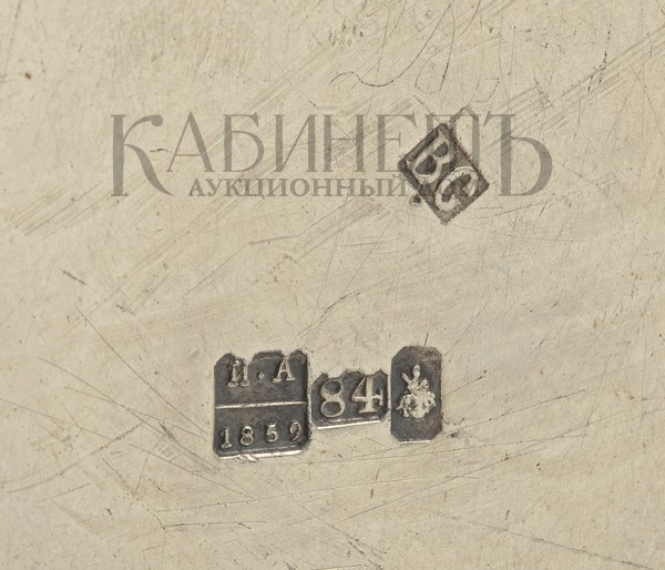 Клейма: пробирное «84» с клеймом г. Москвы, инициалы пробирного инспектора с датой «1859», в прямоугольном щитке именник мастера «ВС».