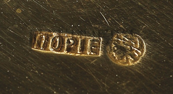 Клейма: пробирное «84» в прямоугольном щитке; именник мастера «Е.Ч.»; развернутое клеймо фирмы «ЛОРIЕ»; в круглом щитке женская головка, повернутая влево, с инициалами пробирного инспектора «ИЛ » – Ивана Лебедкина.