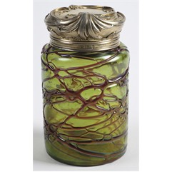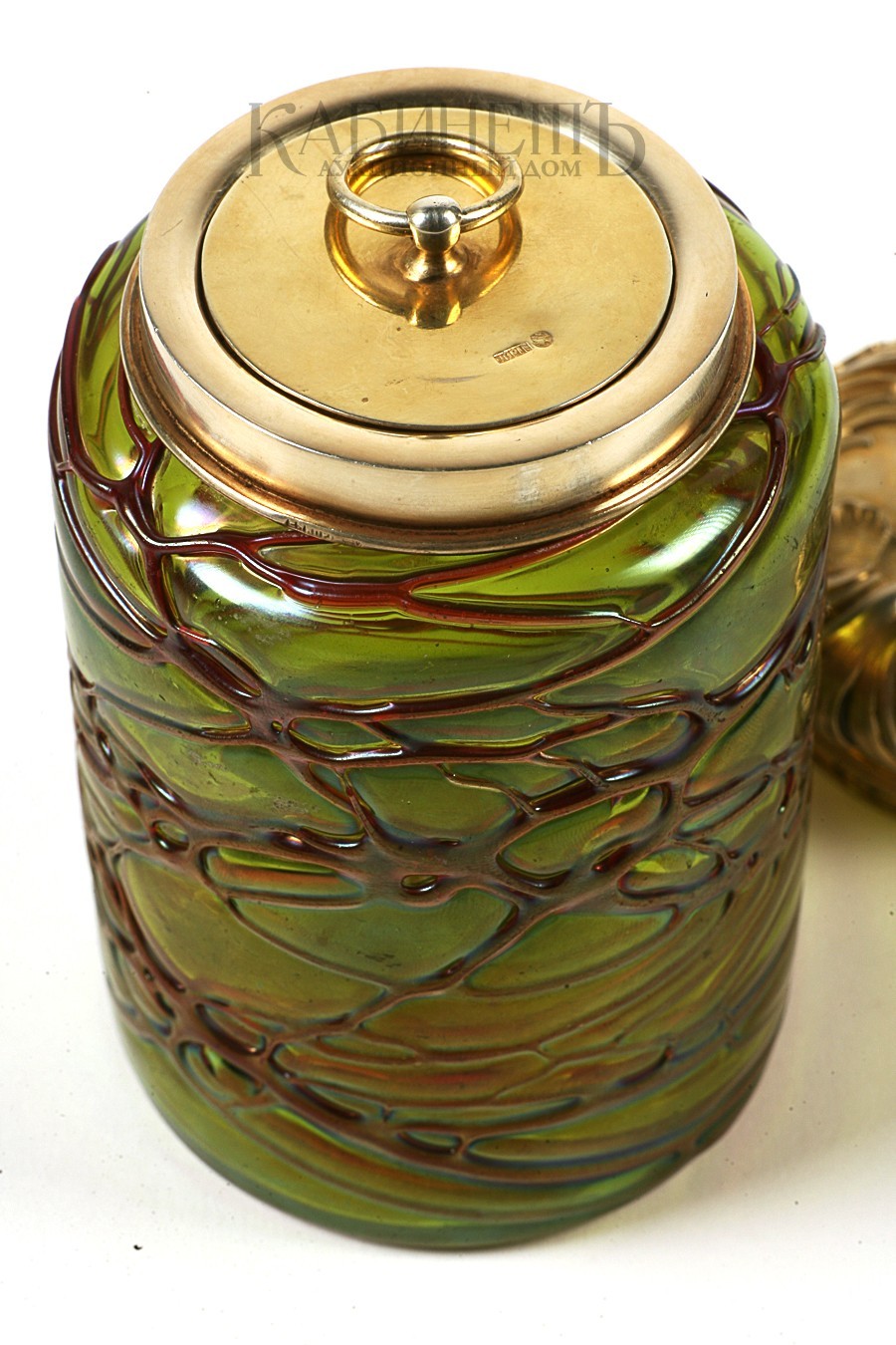 Серебро, чеканка, литье, цветное стекло с нацветом, пробка.