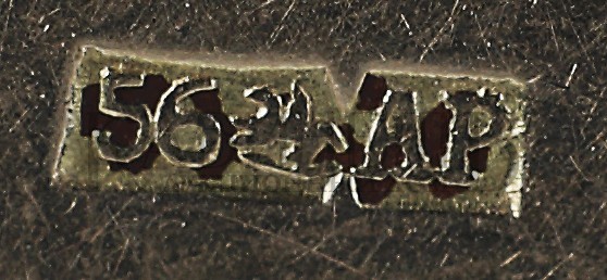 Клейма: пробирное клеймо «56» и городское клеймо Москвы в прямоугольном щитке, всадник повернут влево, именник мастера «А.В.»