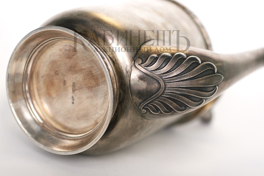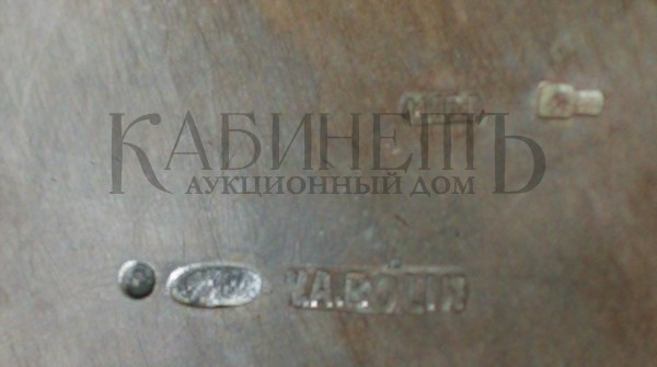 Клейма: пробирное «84» в овальном щитке, с женской головкой, повернутой вправо, с буквой дельта, в круглом щитке женская головка, повернута вправо, с буквой дельта; пробирное в «875» с женской головкой, повернутой вправо, с буквой дельта в щитке в виде лопатки, развернутое клеймо фирмы «Болин», реставрационное клеймо «МЮ6–Р».