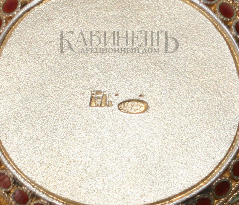 Клейма: пробирное «88» в овальном щитке, с женской головкой, повернутой влево, с инициалами пробирного инспектора «И.Л.»- Иван Лебедкин, именник мастера «IА».