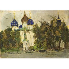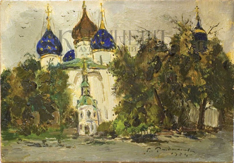 Успенский собор 1954 г. Картон, масло 12,7 х 18,1 см Справа внизу подпись и дата: «П.Радимов / 1954». На обороте надпись графитным карандашом: «Успенский собор / 18 х 12,5 / б/м х 1954 / П.Радимов».