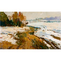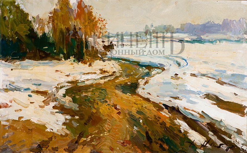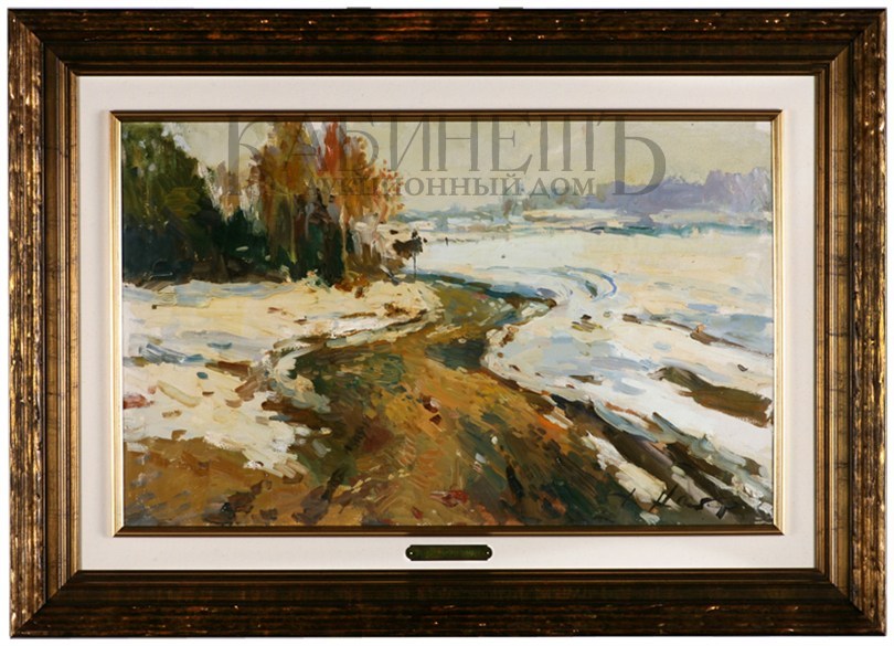 Справа внизу авторская подпись. На оборотной стороне справа вверху надпись: «Тающий снег/ Начало весны 1989 г/ 80 х 50».Оформлена в современную раму.
