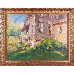 Дом в Островне приобретает черты живого существа. Он – обязательный персонаж воспоминаний о К.А. Коровине того времени и главный герой последних крупных русских работ Коровина. В. Рождественский писал: «В Островне от старинного поседевшего дома шла дорожка к озеру, заросшему кугой и камышом, в нем водились крупные щуки. Все это: старый дом, рыбное озеро - сманило Коровина в Островну... Вспоминаю картины Константина Алексеевича, написанные им за это время. Это была серия полужанровых портретов Вышеславцевой с гитарой, при вечернем освещении, на фоне темных золотистых деревянных стен. Картины напомина- ли старинные русские романсы, их теплую интимную лирику... <... > Подхожу к потемневшему от времени деревянному двухэтажному островненскому дому с пристроенными позднее балконами. Дом зимой выглядит обыкновеннее, и пейзаж около него скучен. <...> По неудобному крыльцу вхожу в помещение. Внутри оно характернее, чем снаружи: двухсветный с колоннами зал напоминает далекое прошлое и другую жизнь с ее своеобразной эстетикой <...> В комнате холодно и неуютно: на полу, на окнах, на столе валяются окурки, чувствуется, что хозяину все как-то безразлично. <...> Вспоминаю о другом Коровине: опять Островно, летний вечер в золоте уходящего солнца. На балконе за чаем семья художника, Вышеславцевы и гости. Вдали затихшее озеро, пахнет цветущая сирень, лето какой-то благодатью наполняет природу. Константин Алексеевич тут же у балкона пишет пейзаж, его нисколько не смущает оживленное общество, а, наоборот, нравится. Он весел, шутит, с увлечением работает».