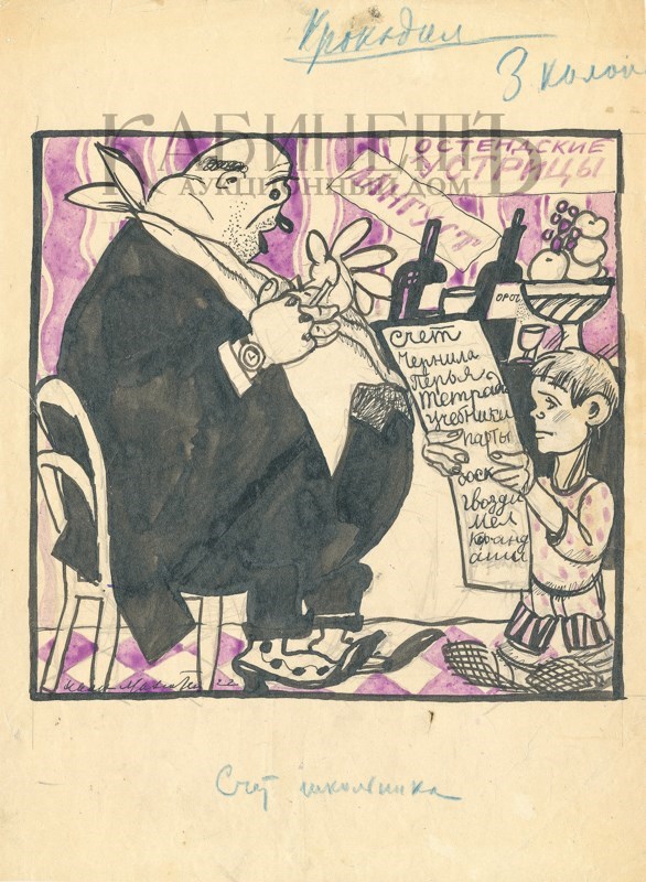 Слева внизу подпись и дата: «Иван Малютин 22». Сверху пометка цветным карандашом «Кро- кодил 3 колон[ки]», снизу цветным карандашом название «Счет школьника».