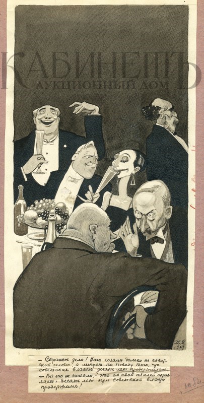 На отдельном листке подпись: «– Странное дело! Наш хозяин далеко не советский человек, а ликует по поводу того, что советская власть десять лет продержалась. – Вы его не поняли, – это он свой юбилей справляет: десять лет при советской власти продержался!».