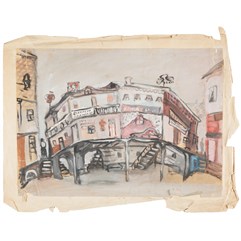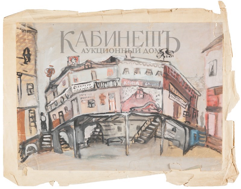 Надрывы и незначительные утраты по краям, замятости, пятна от воды. На обороте надписи: «Хлопчик/ 1 картина II и III актов/ М Аксельрод/ Театр и драма № 6», печать театра им. Моссовета, номер «265».
