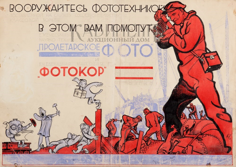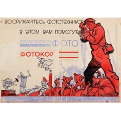 На изображении надпись: «Вооружайтесь фототехникой/ поставленной на службу соц. строительству и /классовой борьбе/ в этом вам помогут/ ежемесячный творческо-методический и научно-технический журнал/ «Пролетарское фото» / и/ ежедекадная массовая газета/ «Фотокор».