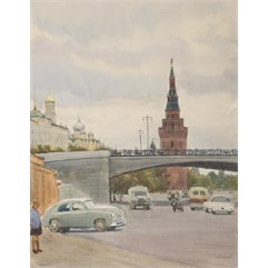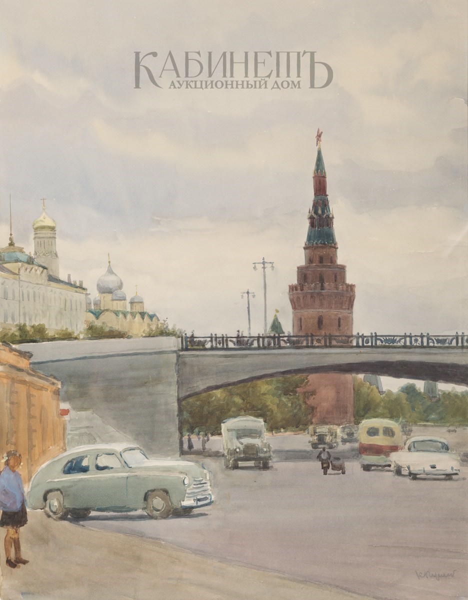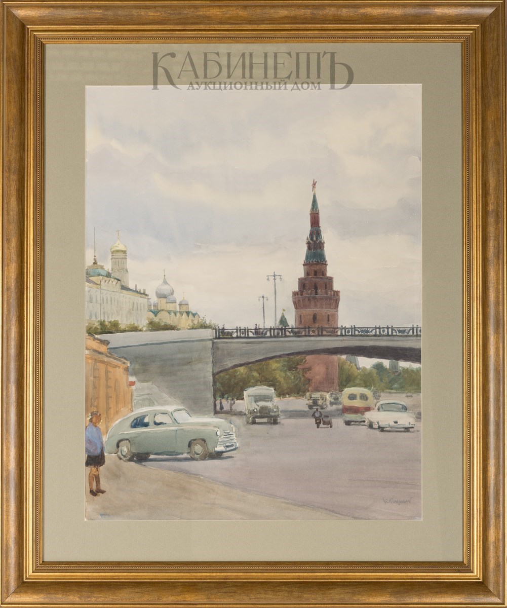 На оборотной стороне слева внизу графитным карандашом авторская подпись, название и датой: «ККупецио/ Каменный мост 1959 г». Оформлена в современную раму с паспарту.