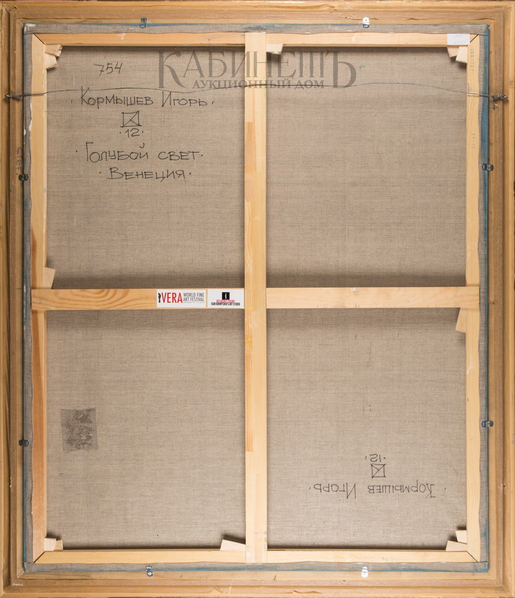 Слева внизу авторская монограмма и дата: «12». На оборотной стороне слева вверху авторская надпись: «754/ Кормышев Игорь», монограмма с датой и название: «Голубой свет/ Венеция»; справа внизу – «Игорь Кормышев», монограмма и дата «12».