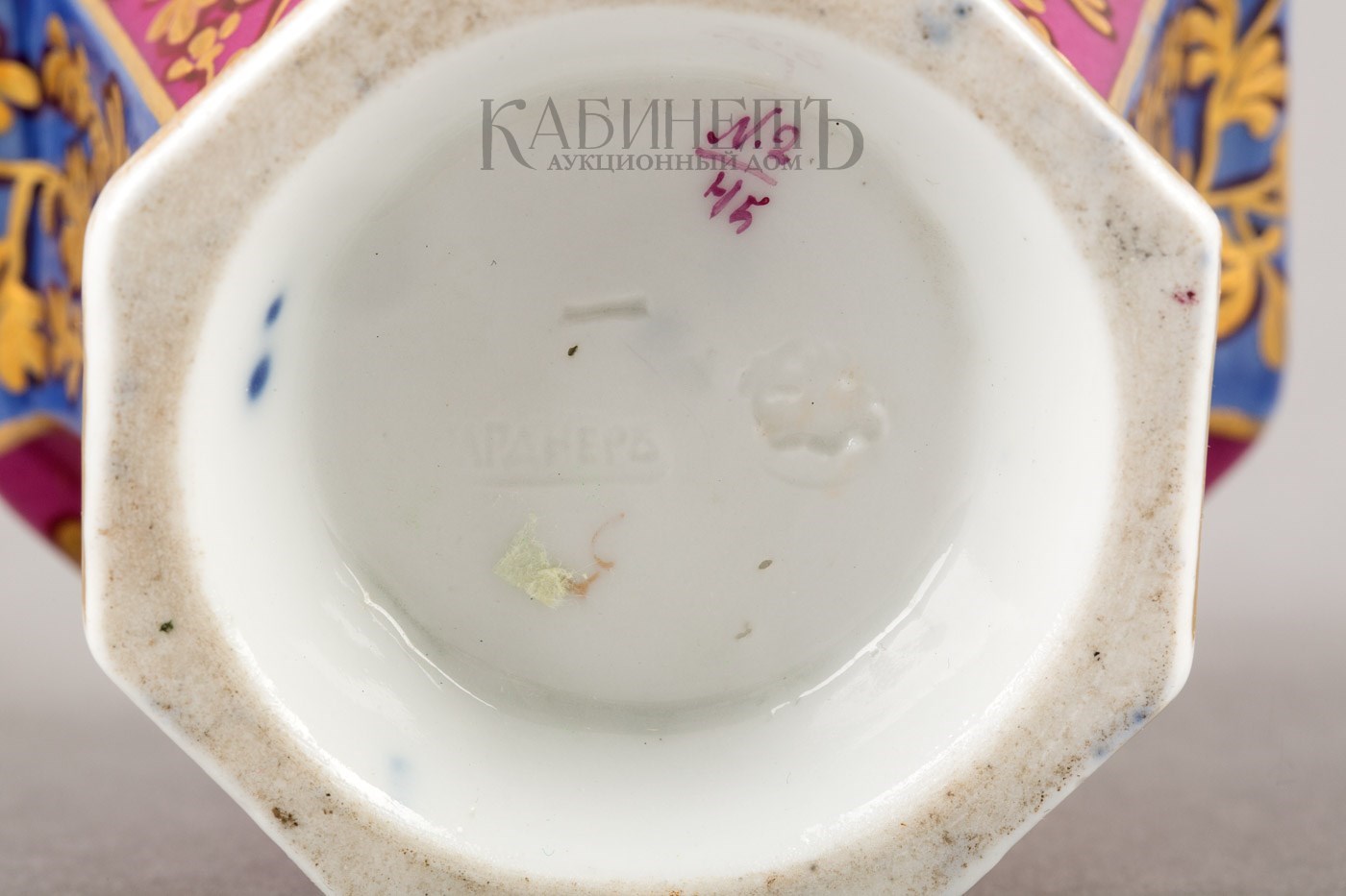 Марки: в тесте – оттиск клейма «Гарднеръ», оттиск в виде Георгия Победоносца; две подглазурных точки кобальтом, номер.