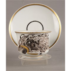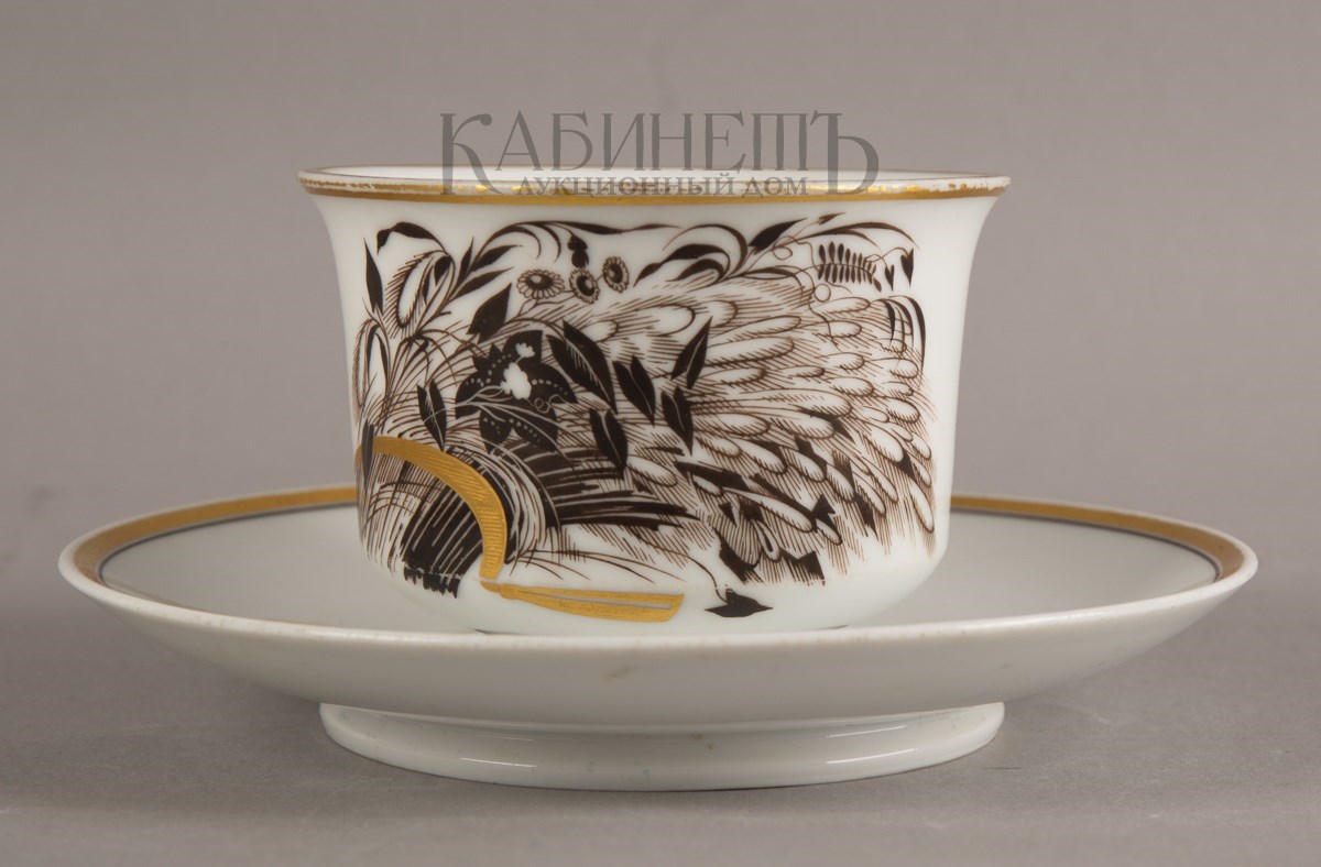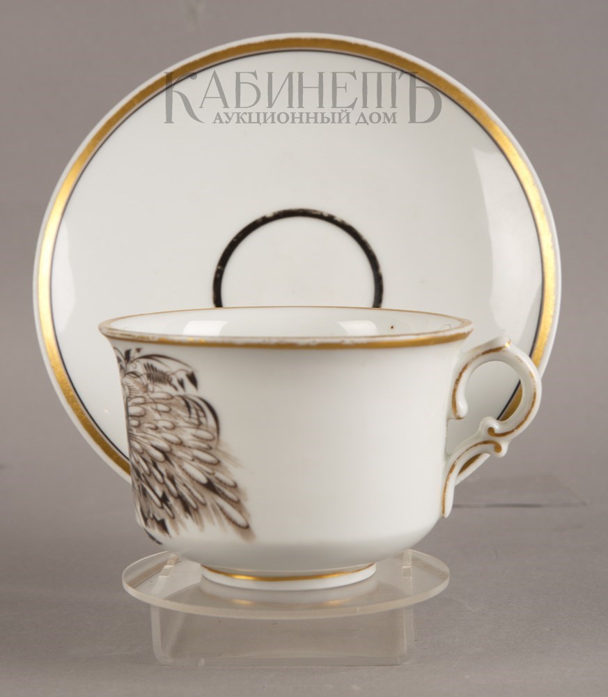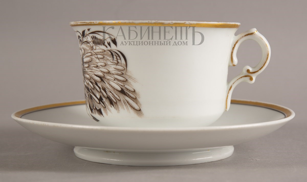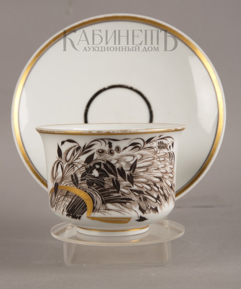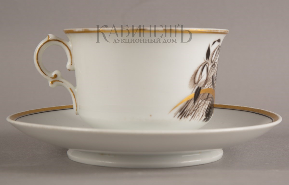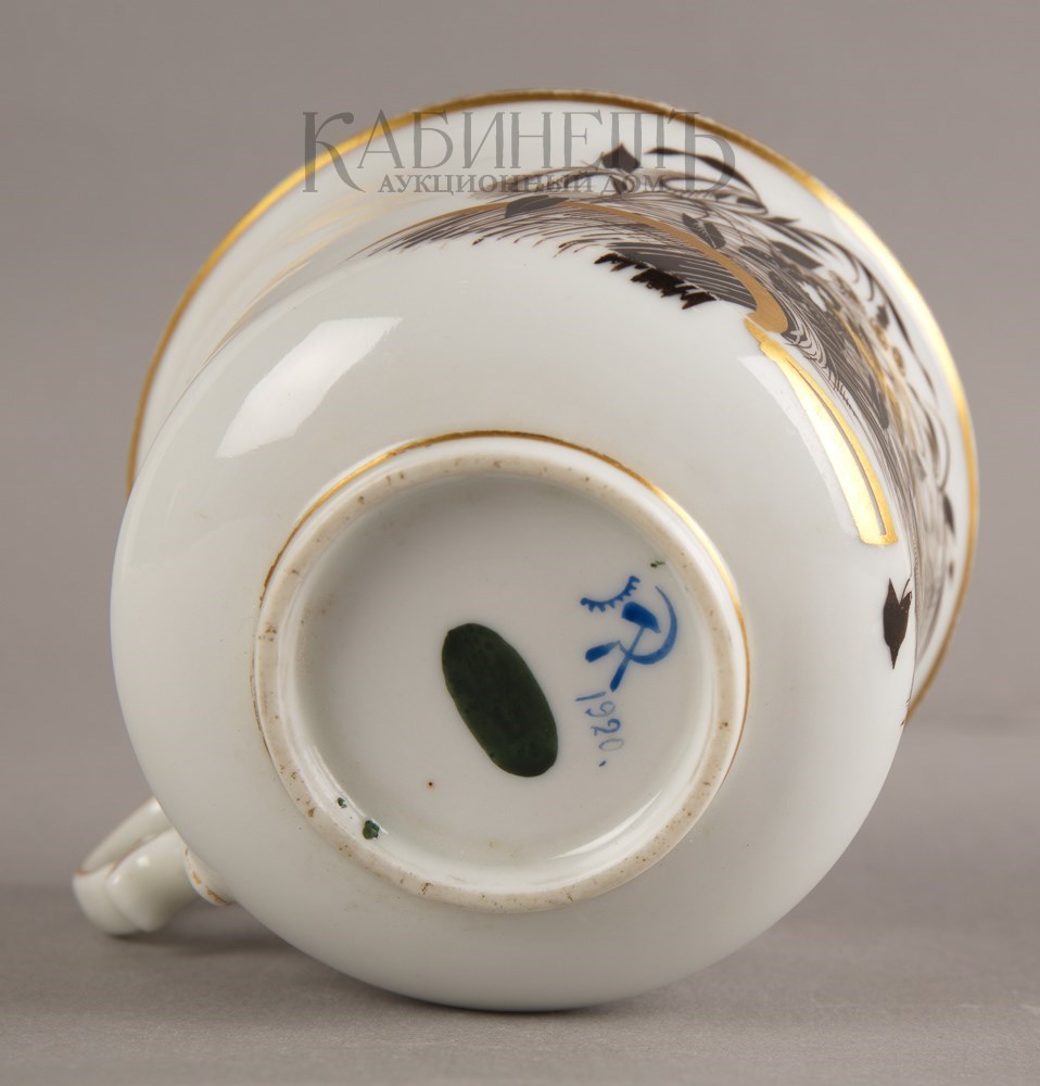 На дне чашки: дореволюционная марка «А-III под короной» с указанием двух последних цифр года «89» закрашенная темно зеленым овалом, синяя надглазурная марка «Серп, молот и часть шестерни» с указанием года «1920».