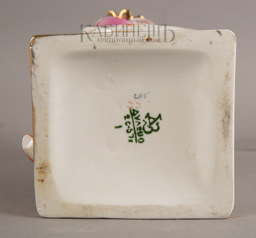 Марки: зеленая завода, «2С [второй сорт]» и дата «1957» зеленым, цифры «205» синим надглазурно.