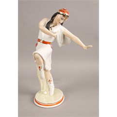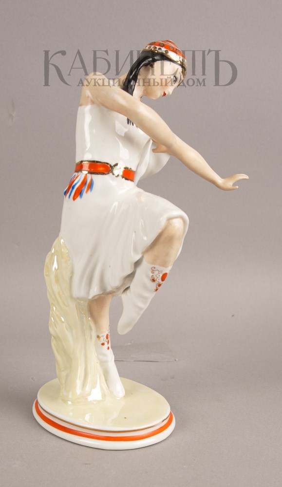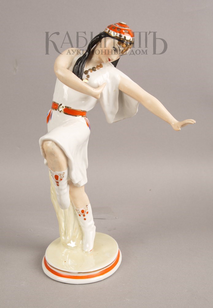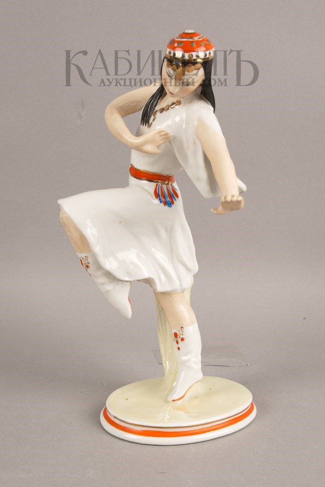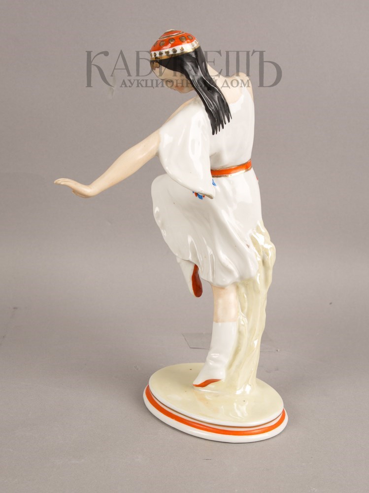 Высота: 23,5 см Фарфор, надглазурная роспись Марки: синяя завода, цифры «123». Заводской дефект на юбке.