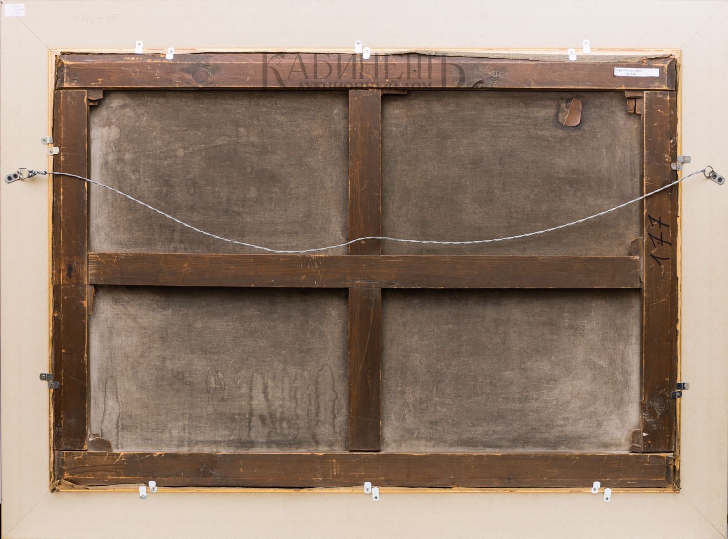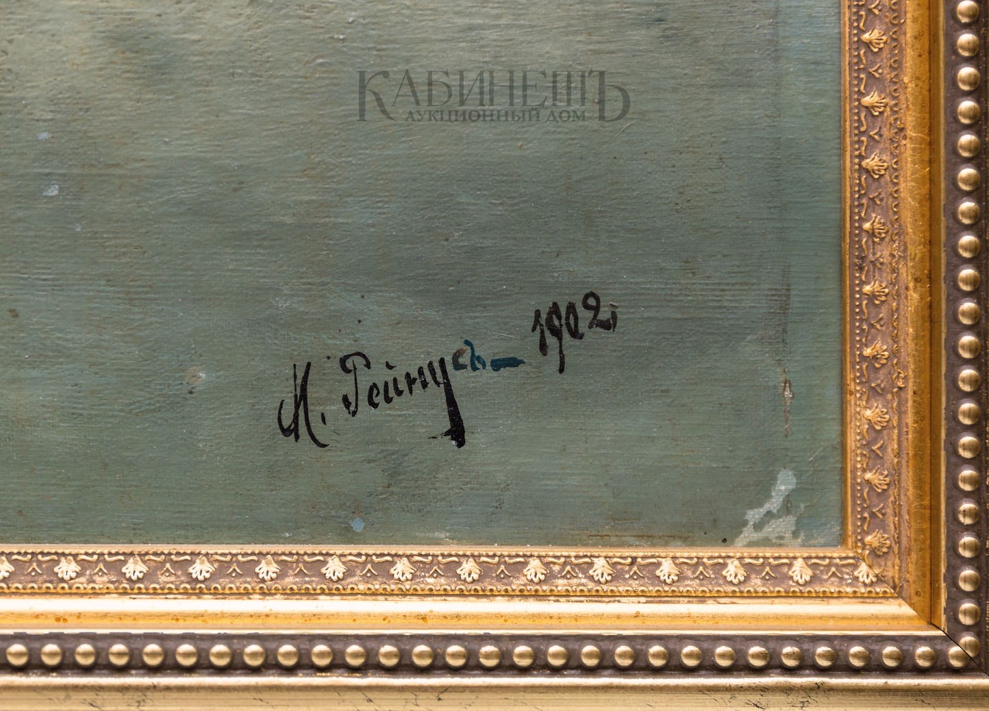 Справа внизу подпись и дата: «М. Рейнусъ 1902». На оборотной стороне заметны следы реставрации основы.