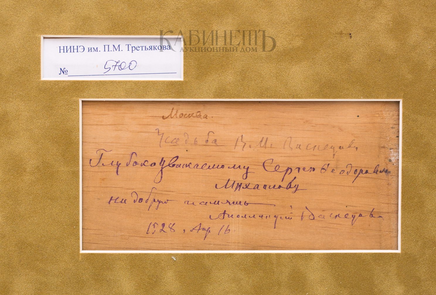 Оформлена в современную раму с паспарту. Слева внизу авторская подпись: «Ап. Васнецовъ». На оборотной стороне чернилами авторская надпись, подпись и дата: «Москва. Усадьба В.М. Васнецова / Глубокоуважаемому Сергею Ѳедоровичу/ Михаилову/ на добрую память./ Аполлинарий Васнецовъ./ 1928, Апр. 16». Справа вверху красным карандашом цифры: «40».
