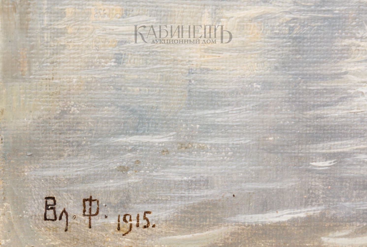 Слева внизу авторские инициалы и дата: «Вл. Ф. 1915.». На обороте картона остатки надписей шариковой ручкой.