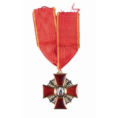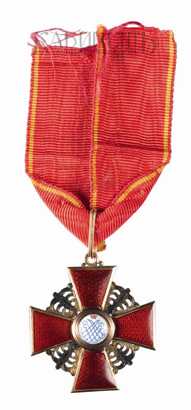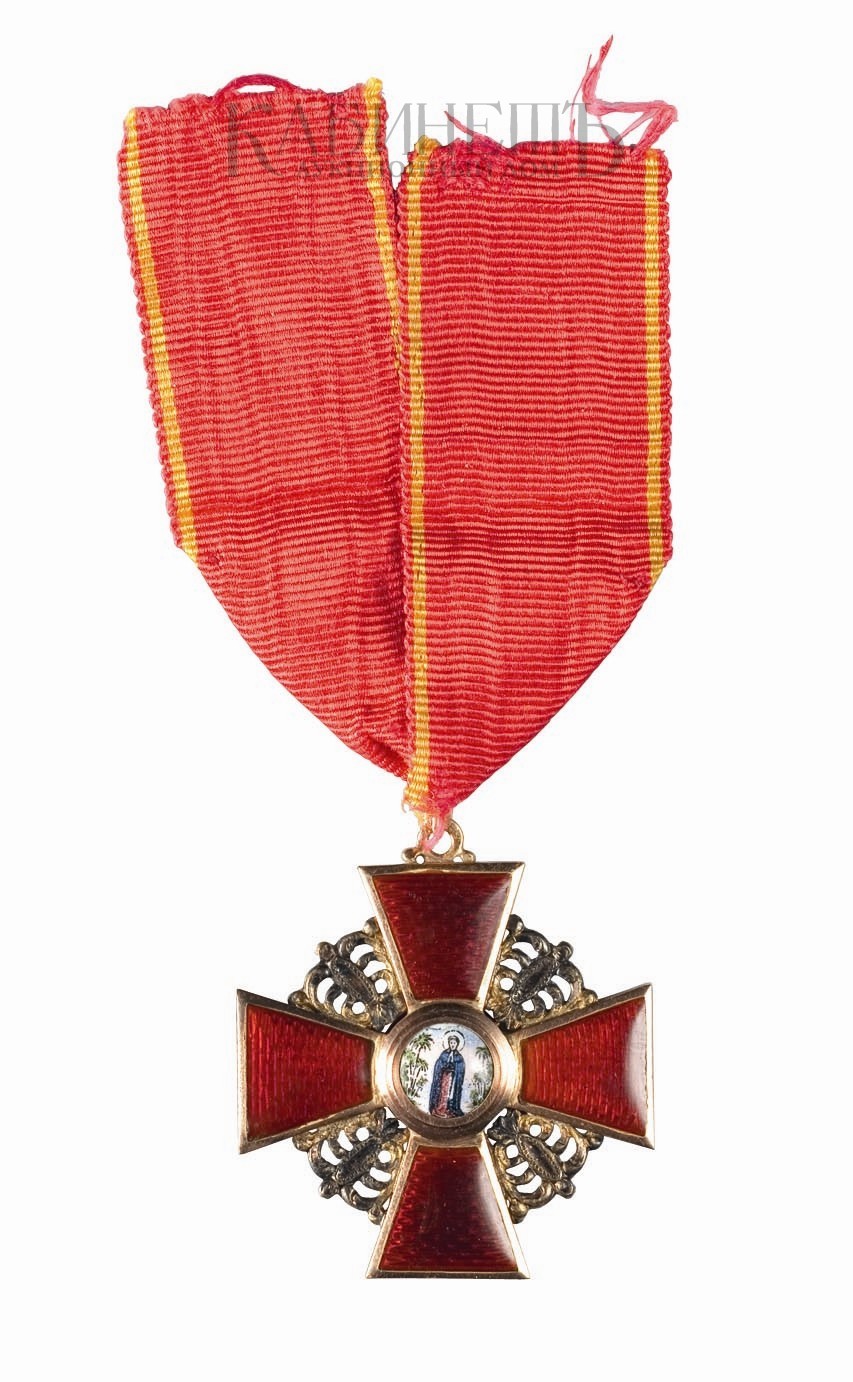 Клейма: на ушке – 56-й пробы с женской головкой в кокошнике, повернутой влево; на оборотной стороне на верхнем луче под эмалью именник «ИЛ», на нижнем луче – развернутое клеймо «Эдуардъ»