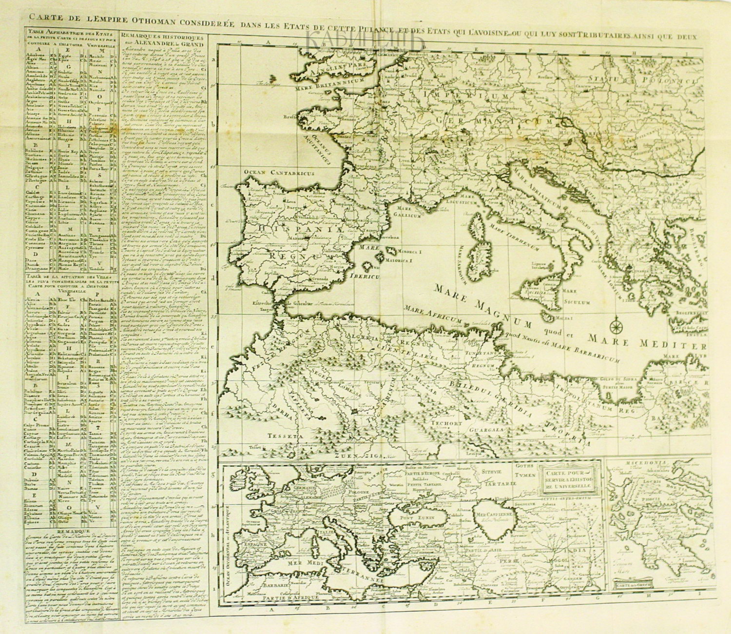 Carte de L`ampire Othoman consideree dans le setats decette Puis sance, et des Etats qui L`avoisineou qui luy sont Tributaires ainsi que deux petites cartes pour conduire a l1histoire universel et en Particulier a l`histtoire d`Alexandere le Grand, dresses sur les instructions les pous nouvelles. Шателен Анри. Карта Османской империи. Амстердам, издательский дом Шателен, 1714.