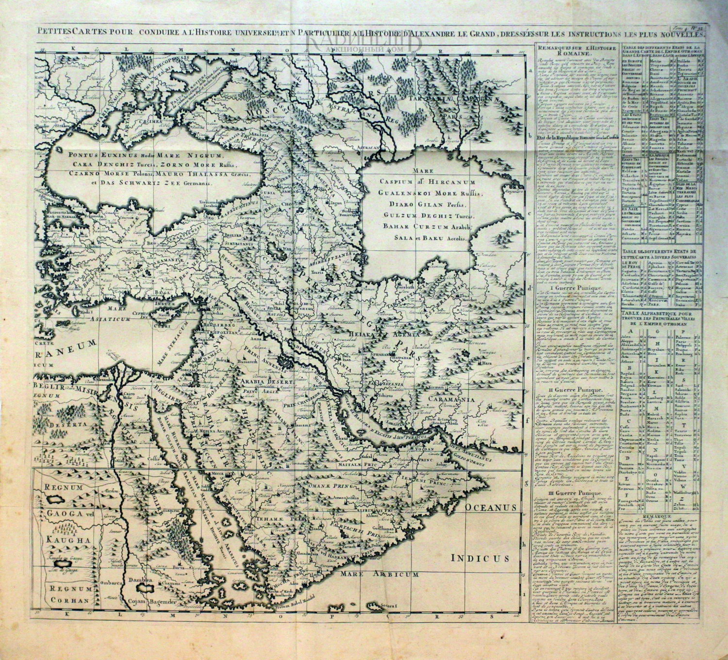 Одна из немногих карт этой эпохи, которая охватывает всю Османскую Империю. Карта отображает все Средиземноморье и включает в себя турецкие владения в Северной Африке. Простирается от Каспийского Моря до Персии и распространяется на Аравийский Полуостров, охватывает огромную часть южной Европы и северной Африки. Так же на карту нанесены две врезки с картами Македонии и Греции. Большое внимание уделено географическим особенностям региона, нанесены все горные хребты и водные объекты. Карта сопровождается двумя большими таблицами, которые содержат подробный список городов и государств, и дает их точное местоположение, так же даны таблицы с историческими справками о военных походах Александра Македонского и из истории Римской империи.