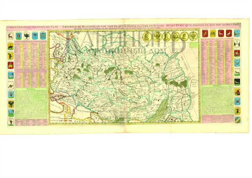 Лист №32 из четвертого тома Атласа «Historique, OuNouvelleIntroductionAL'Histoire» издательского дома Шателен. Карта подготовлена на основе двух наиболее совершенных в то время картографических источников: картографических материалов по северной и южной части Российской империи Гийома Делиля, и азиатская часть карты основана на карте Эверта Исбрандта Идеса, известного путешественника, в 1692–1695 годах совершившего поездку в Китай по поручению русского правительства. По обе стороны от карты расположены информационные таблицы, среди них таблица, в которой перечислены царства, княжества и провинции, входившие в Российскую империю. Две таблицы рек и озер Российской империи с перечнем в алфавитном порядке.Таблица с перечнем Российских городов. Два больших картуша по обе стороны карты с историческими и географическими справками по Московии и Сибири. Справа в верхней части карты расположен картуш, в котором воспроизведены медали, отчеканенные по случаю Полтавской победы. По обе стороны карту украшают гербы русских городов и земель.