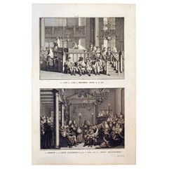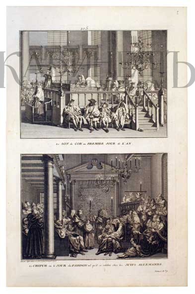 Bernard Picart. Les son du cor au preimier jour de l`an. Le chipur ou le Jour du pardon tel qu`il se cеlеbre chez les juifs allemands. Бернар Пикар. Гравюра. «Звук рога в первый день года». «Йом Кипур или День Всепрощения у немецких евреев». Амстердам, 1720-е.