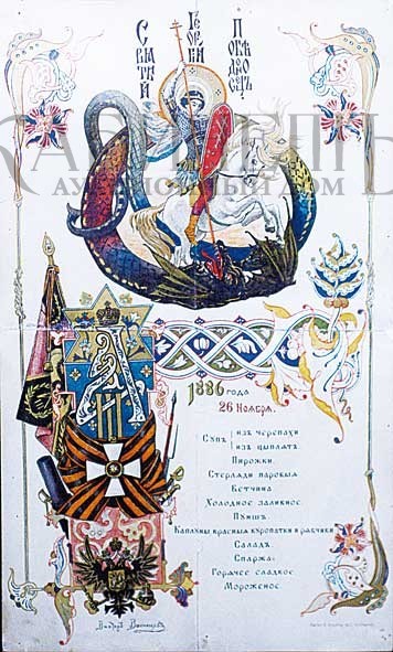 Меню праздничного обеда 26 ноября 1886 года для праздника «Дня Георгиевских кавалеров», устроенного для Георгиевских кавалеров в честь учреждения Ордена Святого Великомученика и Победоносца Георгия. СПб., литография Ильина, 1886. Рисовал Виктор Васнецов