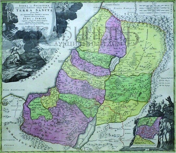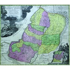 Титульный картуш украшен композицией: Моисей получает Скрижаль Завета на горе Синай. На отдельной врезке показана карта Исхода, украшенная фигуральным картушем с изображением первосвященника и пророка. Приведена масштабная шкала с четырьмя линейками.