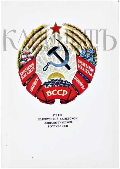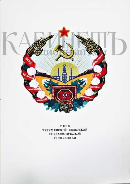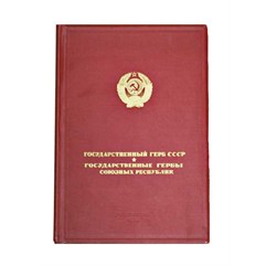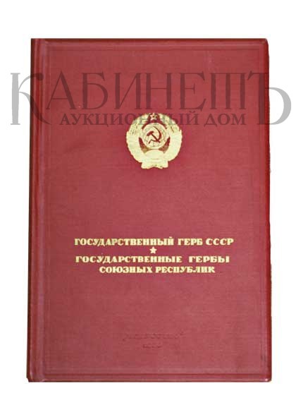 Экземпляр в издательском коленкоровом переплете с золотым тиснением, на форзаце подпись российского художника Николая Мусатова. 17 изображений гербов СССР и союзных республик на отдельных плотных листах. Блок немного оторван от корешка. В издание вложен макет герба «Кыргыз ССР» на кальке и лист с государственными флагами союзных социалистических республик»