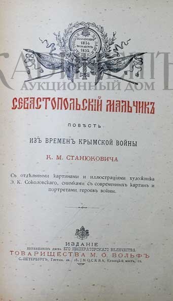 Станюкович К.М. Севастопольский мальчик. Повесть из времен Крымской войны. С отдельными картинками и иллюстрациями художника Э.К. Соколовского, снимками с современных картин и портретами героев войны. СПб. – М., Издание поставщиков Его Императорского Величества товарищества М.О. Вольф , 1903.