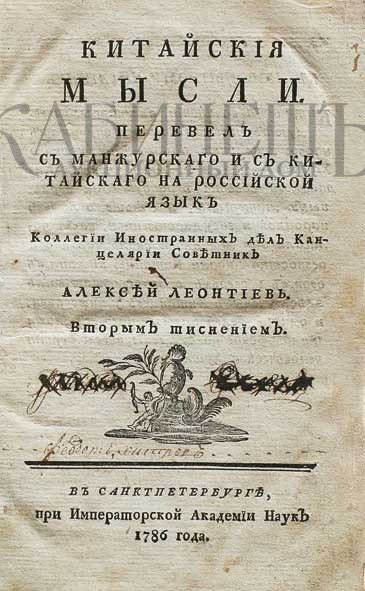 Китайския мысли. Перевел с манжурскаго и с китайскаго на российской язык Коллегии Иностранных дел Канцелярии Советник Алексей Леонтьев. Вторым тиснением. СПб., при Императорской Академии Наук, 1786.