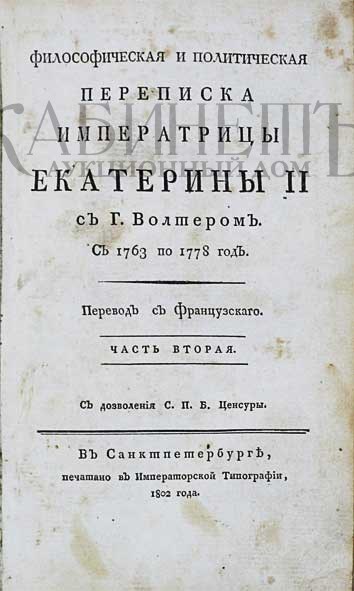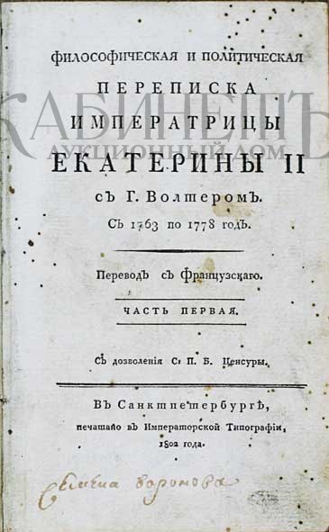 В книге 1802 года «Переписка российской императрицы Екатерины II c Вольтером с 1763 по 1778 год» представлено более 150 писем от Вольтера к Екатерине II и ответы Екатерины II к Вольтеру. В книге размещеныдва гравированных портрета.