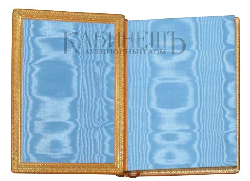 муаровые форзацы, на форзацы нанесена дублюра, тисненная золотом, тройной золотой обрез, ляссе,