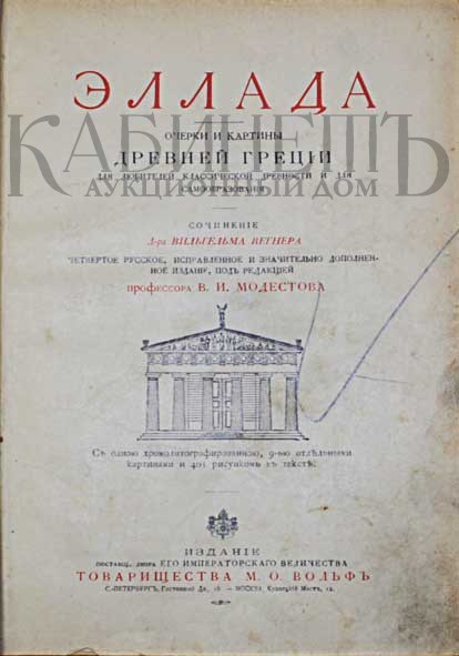 Вегнер Вильгельм. Эллада. Очерки и картины древней Греции для любителей классической древности и для самообразования. Четвертое русское издание, исправленное и значительно дополненное, под редакцией профессора В.И. Модестова. С одной хромо-литографированной, девятью отдельными картинами и 401 рисунком в тексте. СПб., издание поставщика двора Его Императорского Величества «Товарищество М.О. Вольф», [1903].