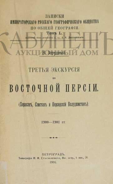 Зарудный Н. Третья экскурсия по Восточной Персии. (Хорасан, Сеистан и Персидский Белуджистан). 1900–1901 гг. Пг., Типография М.М. Стасюлевича, 1916. (Записки Императорского Русского Географического Общества по общей географии. Том L).