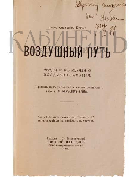 Профессор Альфонс Берже. Воздушный путь. Введение к изучению воздухоплавания. Перевод под редакцией и с дополнениями профессора А.П. Фан-Дер-Флита. С 70 схематическими чертежами и 27 иллюстрациями на отдельных листах. Часть I – Дирижабли. Часть II- Летательные машины. СПб., издание Санкт-Петербургской книжной экспедиции, 1910.