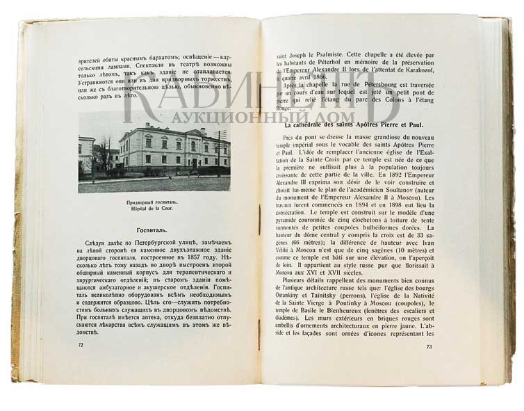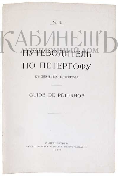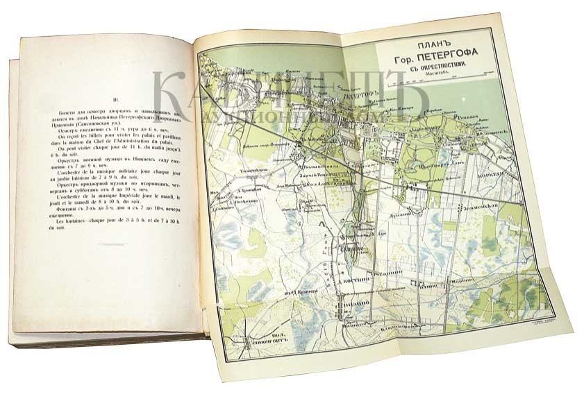 Путеводитель на двух языках русском и французском. В конце издания расположены два плана Петергофа, малого формата и большого формата.