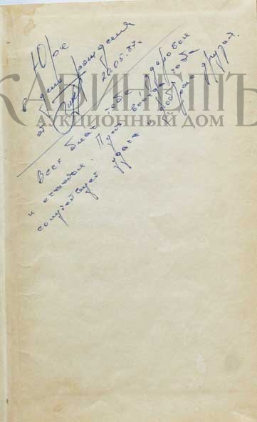 Экземпляр в составном коленкоровом переплете, на форзаце владельческая дарственная надпись: «Юре в день рождения…»