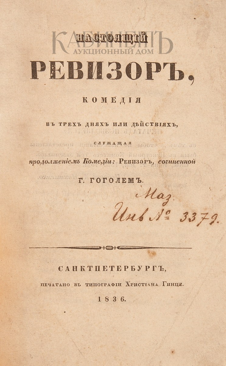 «Премьера комедии Н. В. Гоголя «Ревизор» состоялась в апреле 1836 г. Как предполагают исследователи, сразу же после этого по инициативе Николая I была заказана пьеса, которая ослабила бы сатирическое звучание «Ревизора» и в которой были бы нака- заны чиновники-преступники. Уже 14 июля в Санкт-Петербурге и 27 августа в Москве состоялись премьерные спектакли комедии «Настоящий Ревизор».Имя автора на афишах не было указано, не названо оно и в печатном издании, вышедшем в том же 1836 г. Через некоторое время появились упоминания, что автор – «некий князь Цицианов». Только в 1985 г. была опубликована книга Р. С. Ахвердян, в которой на основании архивных документов доказывается авторство Д. И. Цицианова.