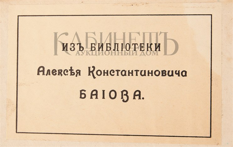 Экземпляр в издательском картонажном переплете, с золотым тиснением по корешку, в хорошей сохранности, не- значительные надрывы на верхней и нижней частях корешка, владельческие пометки орешковыми чернилами, под переплетом сохранена нижняя издательская бумажная обложка. На форзаце расположен экслибрис: «Из библиотеки Алексея Константиновича Баиова». Перепутаны страницы - стр. 9-10 находятся между страницами IV-V.