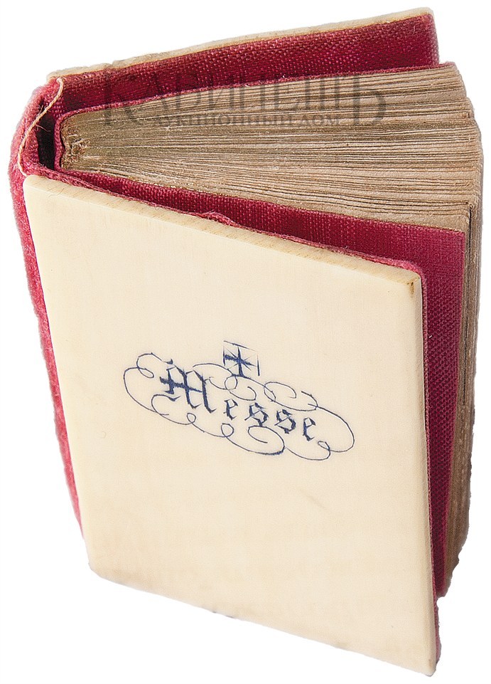 Экземпляр в бархатном переплете с золотым обрезом, на крышках расположены костяные накладки. Издание в